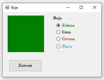 29.10 ● (Boje): Kreirati formu sa imenom Main i sa naslovom “Boje”. Forma treba da sadrži jednu kontrolu Label , dimenzija 125×125 piksela kod koje je svojstvo BorderStyle postavljeno na FixedSingle. Na formi postoji i kontrola GroupBox unutar koje su raspoređena i četiri kontrole RadioButton koje će omogućiti izbor jedne od boja: zele, crna, crvena i plava. Boja teksta svake od kontrola RadioButton određena je u skladu sa bojom koju predstavlja. Izborom RadioButton kontrole menja se i svojstvo BackgroundColor kontrole Label. Po otvaranju forme izabrana je kontrola RadioButton koja predstavlja zelenu boju. Na formi postoji i kontrola Button sa natpisom “Zatvori” sa uobičajenom funkcionalnošću. Korisnički interfejs, vidljiv po pokretanju forme, prikazan je na Slika_29_10.