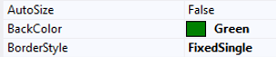 Prilikom dizajniranja forme, svojstvo BackColor , kontrole Label za prikaz izabrane boje treba postaviti na Green, BorderStyle na FixedSingle a AutoSize na false. To se postiže podešavanjem tih svojstava u okviru panela Properties na uobičajeni način(Slika_29_11):
