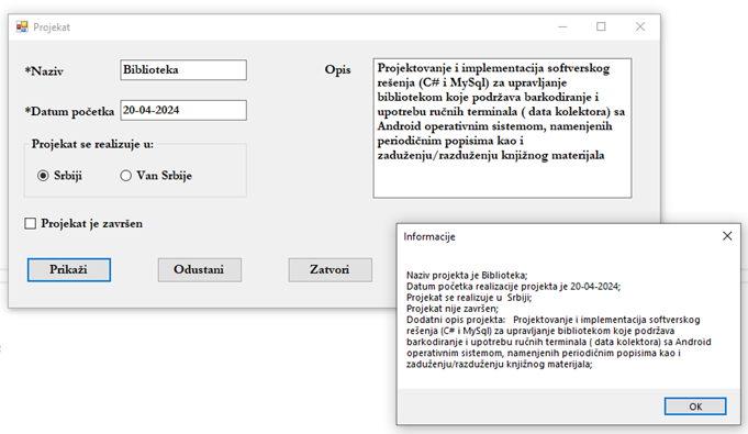 29.11 ● (Projekat): Kreirati formu sa imenom Main koja u naslovu ima tekst”Projekat”. Na formi postoje dve TextBox kontrole sa pripadajućim Label kontrolama koje su namenjene unosu naziva projekta i datuma početka realizacije istog, jedna kontrola GroupBox koja sadrži de RadioButton kontrole za izbor mesta realizacije projekta (“U Srbiji” ili “Van Srbije”), kontroku CheckBox kao  indikator dali je projekat završen ili nije. Uz to forma sadrži kontrolu TextBox za detaljniji opis projekta(omogućiti korisniku upis u više redova). Na kraju na formi postoje tri Button kontrole sa tekstom “Prikaži”, “Odustani” i “Zatvori”. Klikom na prvu Button kontrolu(“Prikaži”) u MessageBox prikazuju se informacije o projektu. Funkcionalnost preostale dve Button kontrole je poznata iz ranijih vežbi(Button kontrola sa tekstom “Odustani” ima istu funkcionalnost kao iButton  kontrola “Poništi” u ranijim vežbama). Pre prikazivanja informacija o projektu , obavezno proveriti dali je korisnik uneo podatke o nazivu i datumu početka realizacije projekta(obavezna polja za unos, dodata je * u tekst pripadajuće kontrle Label). Korisnički interfejs prikazan je na Slika_29_12
