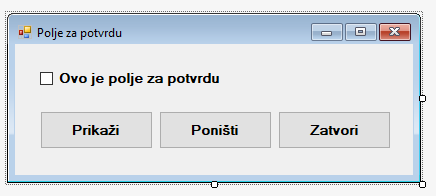 29.4 ● Vežba (CheckBox i Checked): Kreirati formu koja se sastoji od jedne CheckBox kontrole sa tekstom ‘’Ovo je polje za potvrdu’’ i tri Button kontrole sa tekstom ‘’Prikaži’’ , ‘’Poništi’’ i ‘’Zatvori’’. Klikom na dugme ‘’Prikaži’’ treba koristeći klasu MessageBox prikazati poruku ‘’Polje za potvrdu je izabrano” ili ‘’Polje za potvrdu nije izabrano’’ u zavisnosti od statusa kontrole Checbox (potvrđena/nepotvrđena). Klikom na dugme ‘’Poništi’’ status kontroje CheckBox se postavlja na nepotvrđeno(Checked=False) . Klikom na dugme ‘’Zatvori’’ forma se zatvara. Ime forme je Main a u naslovu je Polje za potvrdu. Korisnički interfejs je dat na Slika_29_4