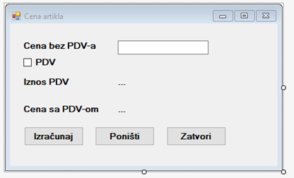 29.5 ● Vežba(Cena artikla sa PDV): Kreirati formu imena Main i koja u naslovu sadrži tekst ‘’Cena artikla’’. Na formi postoji kontrolaTextBox i njoj pripadajuća Label-a koja treba da omogući unos cene artikla bez PDV(tipa double). Uz to postoji i kontrola CheckBox sa tekstom PDV koja treba da odredi dali se u konačnu cenu uračunava PDV ili ne, i  kontrole Label u koje treba upisati iznos PDV i cenu artikla sa PDV-om zaokružene na dve decimale. Na kraju potrebne su  tri kontrole Button sa tekstom ‘’Izračunaj’’ , ‘’Poništi’’ i ‘’Zatvori’’ funkcionalnosti opisane u predhodnim zadacima. Vrednost PDV-a je fiksna i iznosi 20%. Korisnički interfejs prikazan je na Slika_29_5.