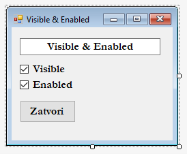 29.6 ● Vežba(Visible & Enabled): Kreirati formu imena Main koja u naslovu ima tekst “Visible & Enabled”.Na formi postoji kontrola TextBox sa proizvoljnim tekstom, ispod nje dve kontrole CheckBox sa tekstom “Visible” i “Enabled” i kontrola Button sa tekstom “Zatvori” čija je funkcija zatvaranje forme. Ukoliko je CheckBox “Visible” potvrđen TextBox je vidljiv a u suprotnom je nevidljiv. Ukoliko je CheckBox “Enabled” potvrđen TextBox je dostupan za interakciju sa korisnikom(Enabled=True) a u suprotnom nije. Korisnički interfejs je prikazan na Slika_29_6.
