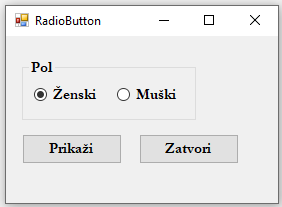 29.7 ● Vežba(kontrola RadioButton): Kreirati formu imena Start koja u naslovu ima tekst “RadioButton”. Na formi postoji kontrola GroupBox koja sadrži dve kontrole RadioButton kojima se bira pol. Forma takođe ima i kontroole tipa Button sa natpisima “Prikaži” i “Zatvori”. Klikom na prvu Button kontrolu, koristeći klasu MessageBox, prikazuje se poruka “Ženski pol” ili “Muški pol” u zavisnosti od izabrane kontrole RadioButto. Klikom na kontrolu Button sa tekstom “Zatvori” , zatvara se forma. Po otvaranju forme izabran je ženski pol. Korisnički interfejs prikazan je na Slika_29_7.