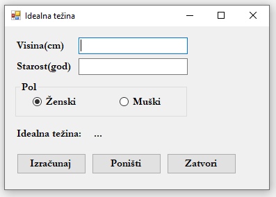 29.8● Vežba(Idealna težina): Kreirati formu imena Main koja u naslovu ima tekst “Idealna težina”. Na formi treba da postoje dva TextBox-a sa pripadajućim labelama za unos visine u cm  starosti  , GroupBox sa dva RadioButton kojima se bira biološki pol i labelu u koju treba upisati izračunatu idealnu težinu. Uz to , forma treba da sadrži i kontrole Button sa natpisima “Izračinaj”, “Poništi”, i Zatvori” čija je funkcionalnost objašnjena u ranijim zadacima. Pre izračunavanja idealne težine izvršiti proveru unetih vrednosti za visinu i starost. U slučaju nekorektnog unosa prikazati odgovarajuću poruku. Formula po kojoj treba računati idealnu težinu je: (visina-100+starost/10)*koeficijent. Koeficijen je 0.9 za muški pol odnosno 0.85 za ženski. Po otvaranju forme podrazumevano je izabran ženski pol. Korisnički interfejs je prikazan na Slika_29_8.