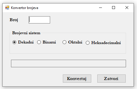 29.9 ● Vežba(Konvertor brojeva): Kreirati formu imena Main koja u naslovu ima tekst “Konvertor brojeva”. Forma sadrži jednu kontrolu TextBox sa pripadajućom kontrolom Label koja je namenjena unosu broja u dekadnom brojevnom sistemu. Na formi postoji i kontrola GroupBox koja sadrži četiri kontrole RadioButton za izbor jednog brojevnog sistema( dekadni , binarni, oktalni i heksadecimalni) kao i kontrolu Label u koju se upisuje konvertovana vrednost unetog broja. Uz to forma sadrži i tri kontrole Button sa natpisima “Konvertuj” i “Zatvori”. Klikom na prvo dugme konvertuje se vrednost unetog broja i prikazuje u odgovarajućoj kontroli Label. Funkcionalnosti druge  kontrole Button(“Zatvori”) objašnjene su u ranijim vežbama. Po otvaranju forme izabran je dekadni brojevni sistem. Pre konverzije proveriti da li je korektno uneta vrednost u kontrolu TextBox. Korisnički interfejs prikazan je na Slika_29_9: